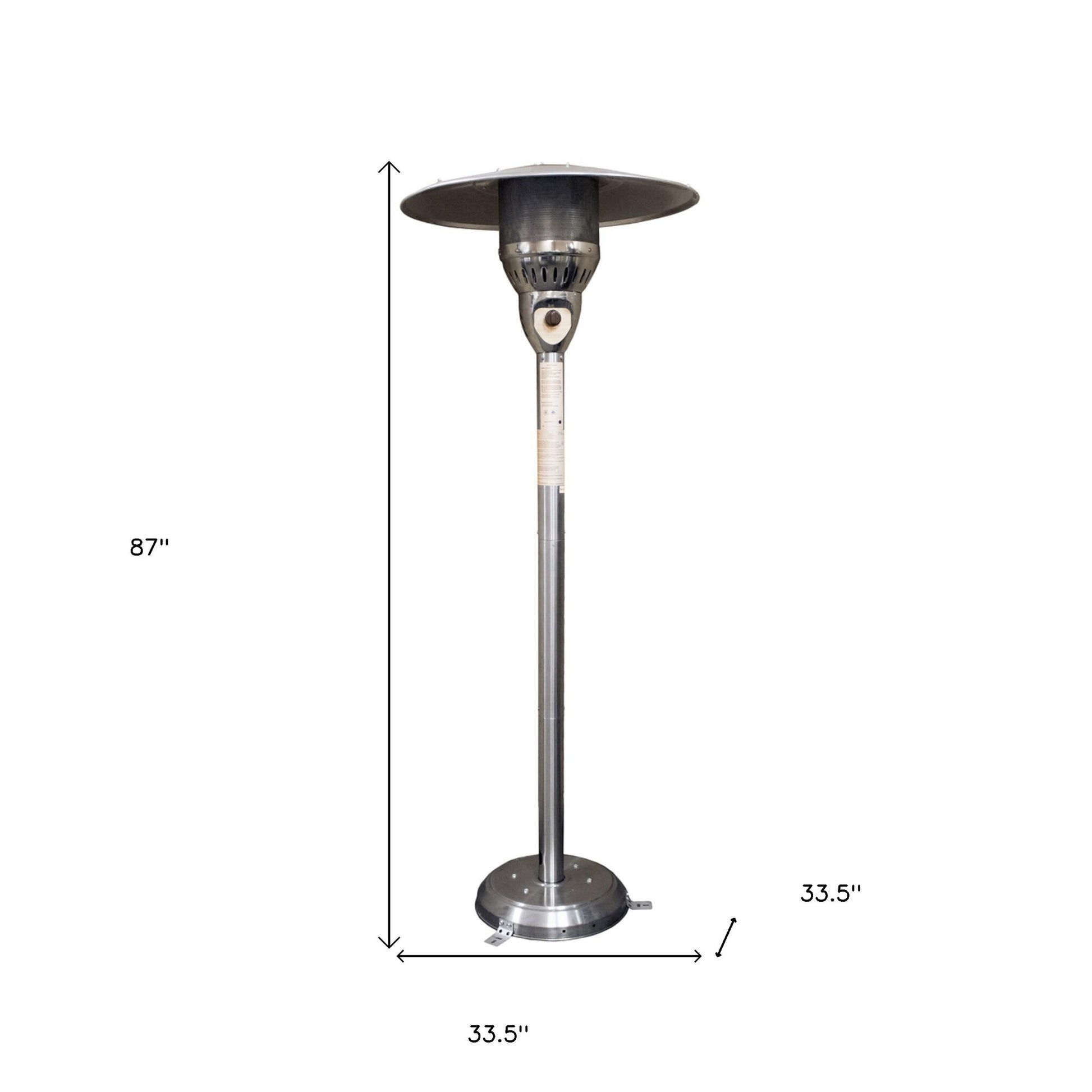 Let your outdoor gatherings go on long after the sun sets with this 41000 btu silver steel natural gas cylindrical pole standing patio heater, the perfect piece to keep your party warm. This unit is fueled by hook up to a natural gas line, which ensures maximum heat and maximum reach that is typically the least costly to operate. Features an automatic safety shutoff feature for your peace of mind. This unit not only provides warmth but is easily portable, making it a great option to take travelling. This heater is not an all or nothing situation, as it features an adjustable setting so you can control the amount of heat to your desired warmth. The outdoors can be cold, but with this heater you will always feel cozy and toasty. 87-inch H x 33.5-inch W x 33.5-inch D